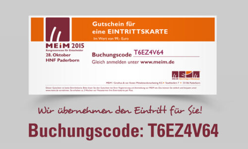 Die Kongressmesse „MEiM – Mehr Erfolg im Mittelstand“ tagt am 28. Oktober 2015 in Paderborn. Auch dieses Jahr sind wir dabei! Besuchen Sie uns auf der größten Kongressmesse für Entscheider in Westfalen. Wir laden Sie ein. Ihr Buchungscode für die kostenlose Anmeldung lautet T6EZ4V64. Die Anmeldung können Sie ganz einfach online vornehmen unter www.meim.de. Bei […]